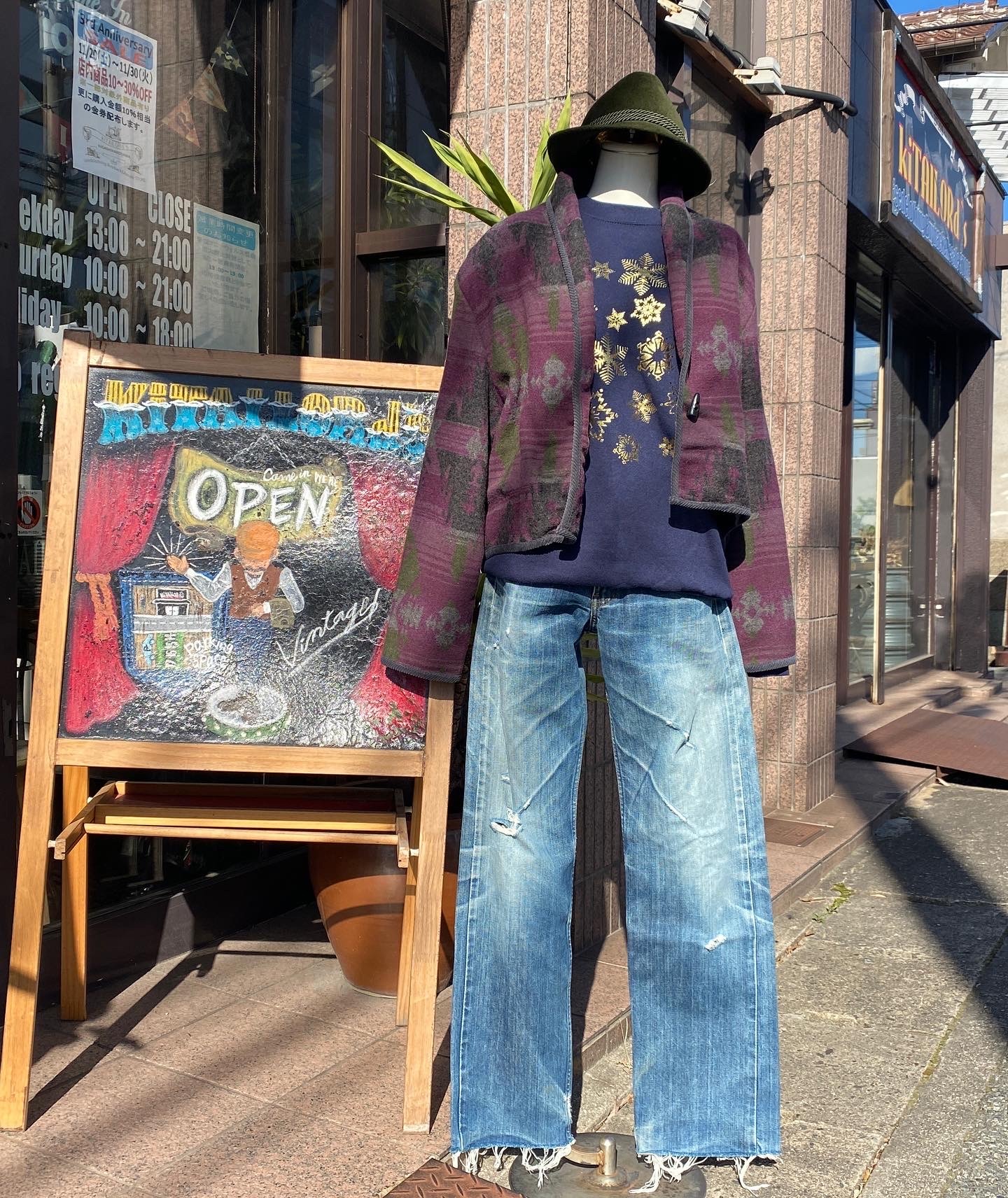 ネイティブ調のショールカラーのウール混紡のジャケットに、金色プリントが豪華さを際立たせるスノーパターンのスウェットシャツ❄️