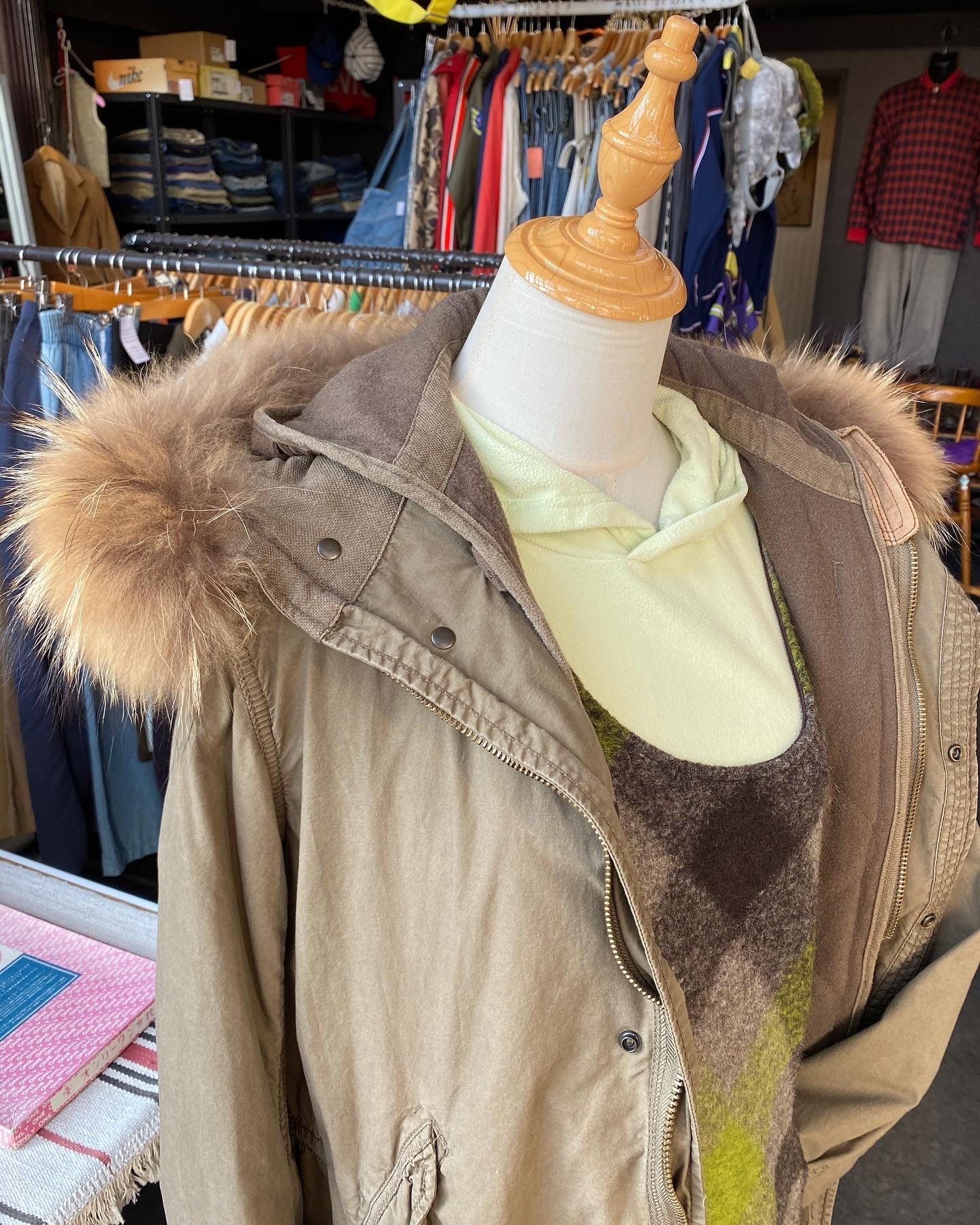 メンズサイズのモッズコート緩く羽織りに、ウール素材のジャンパースカート☝️インナーには色見を合わせたマイクロフリース💚モッズコートはライナー装備で、週明けの寒波にも充分対応出来る一着です👌