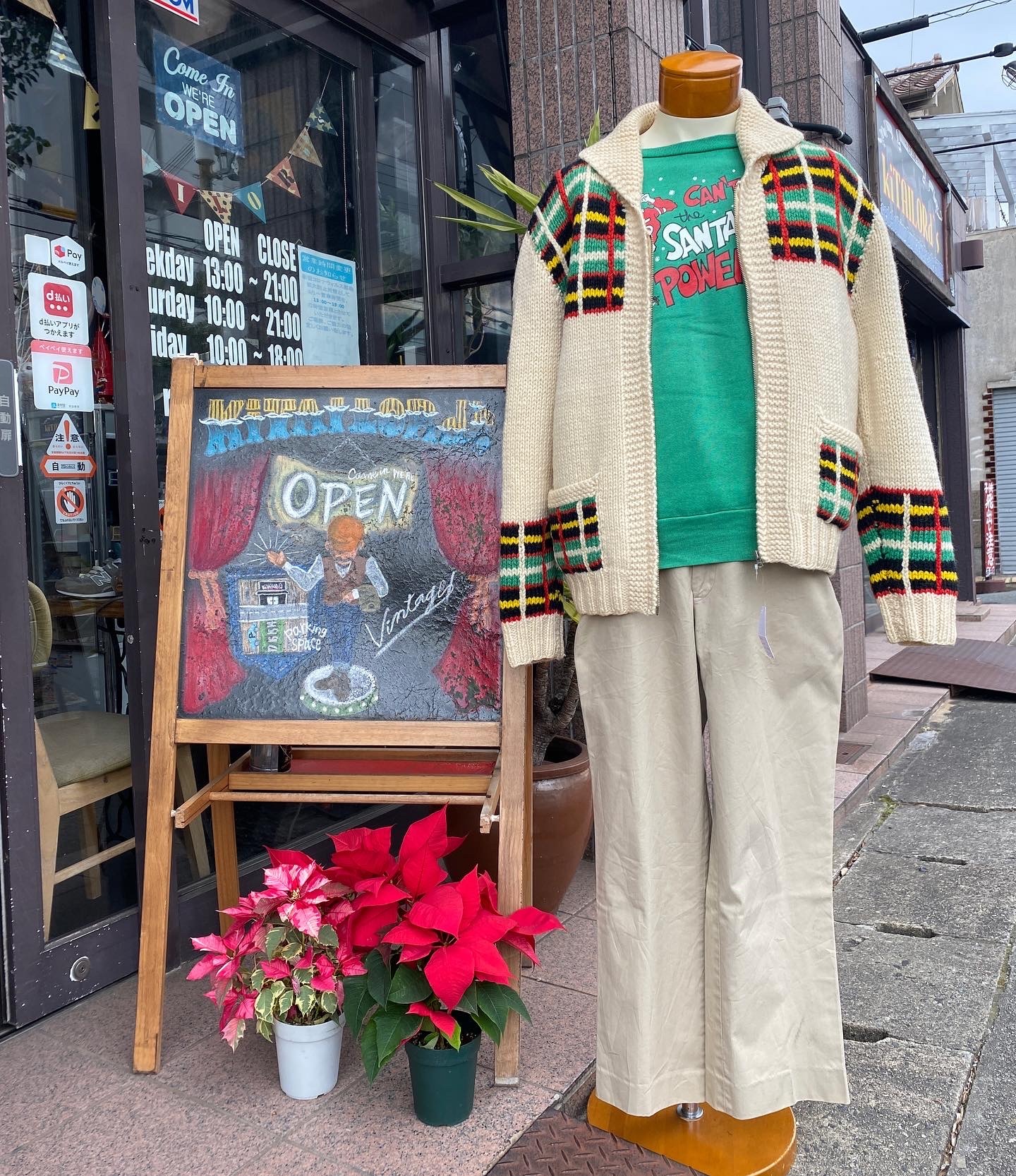 明日本番のクリスマスに着たいグリーンカラーのスウェットシャツをベースに、普段使いでも使えそうなクリスマスコーデ🎄ヴィンテージのカウチンセーターの配色もクリスマスカラーで、パンツは70sのチノトラウザーズ👍