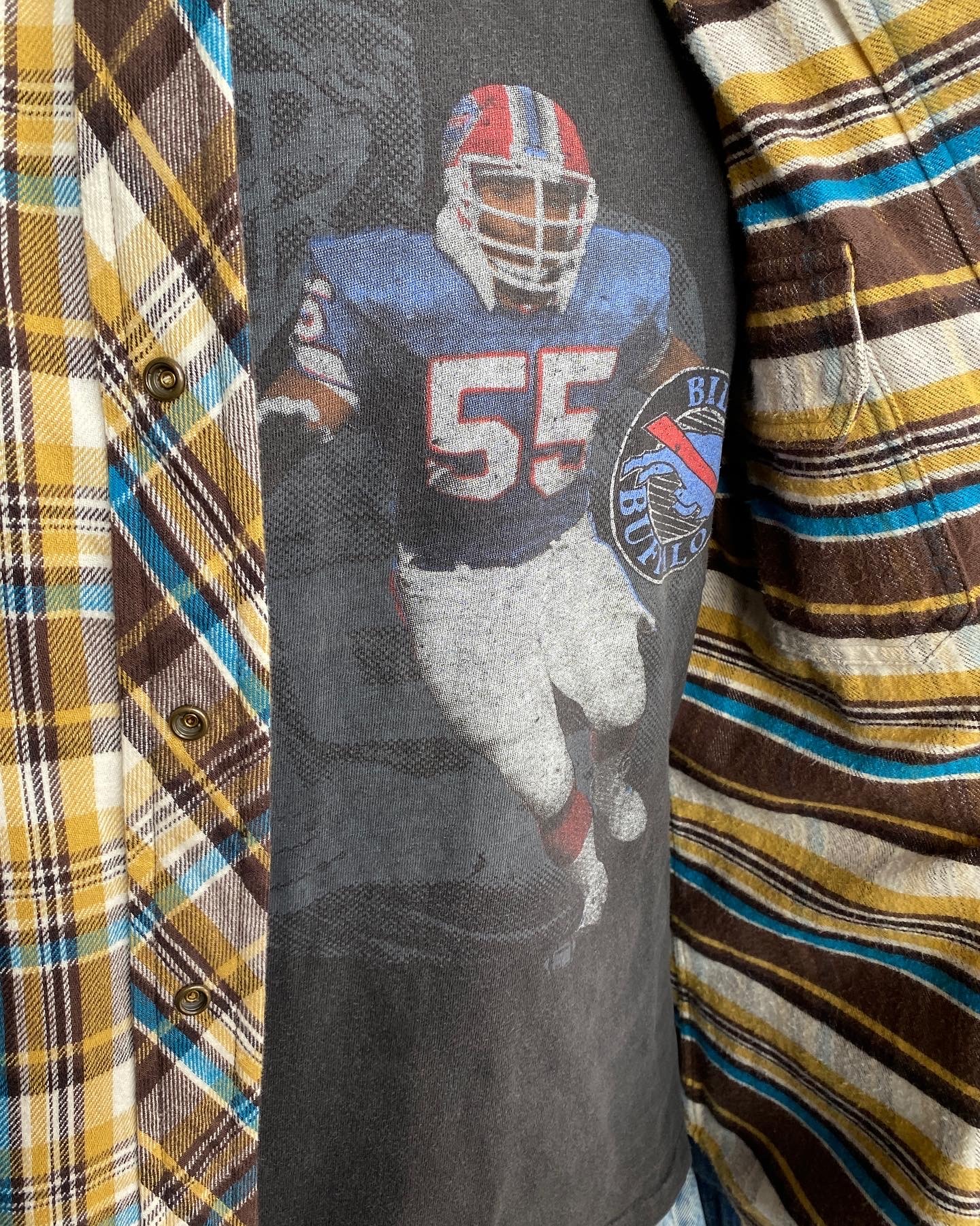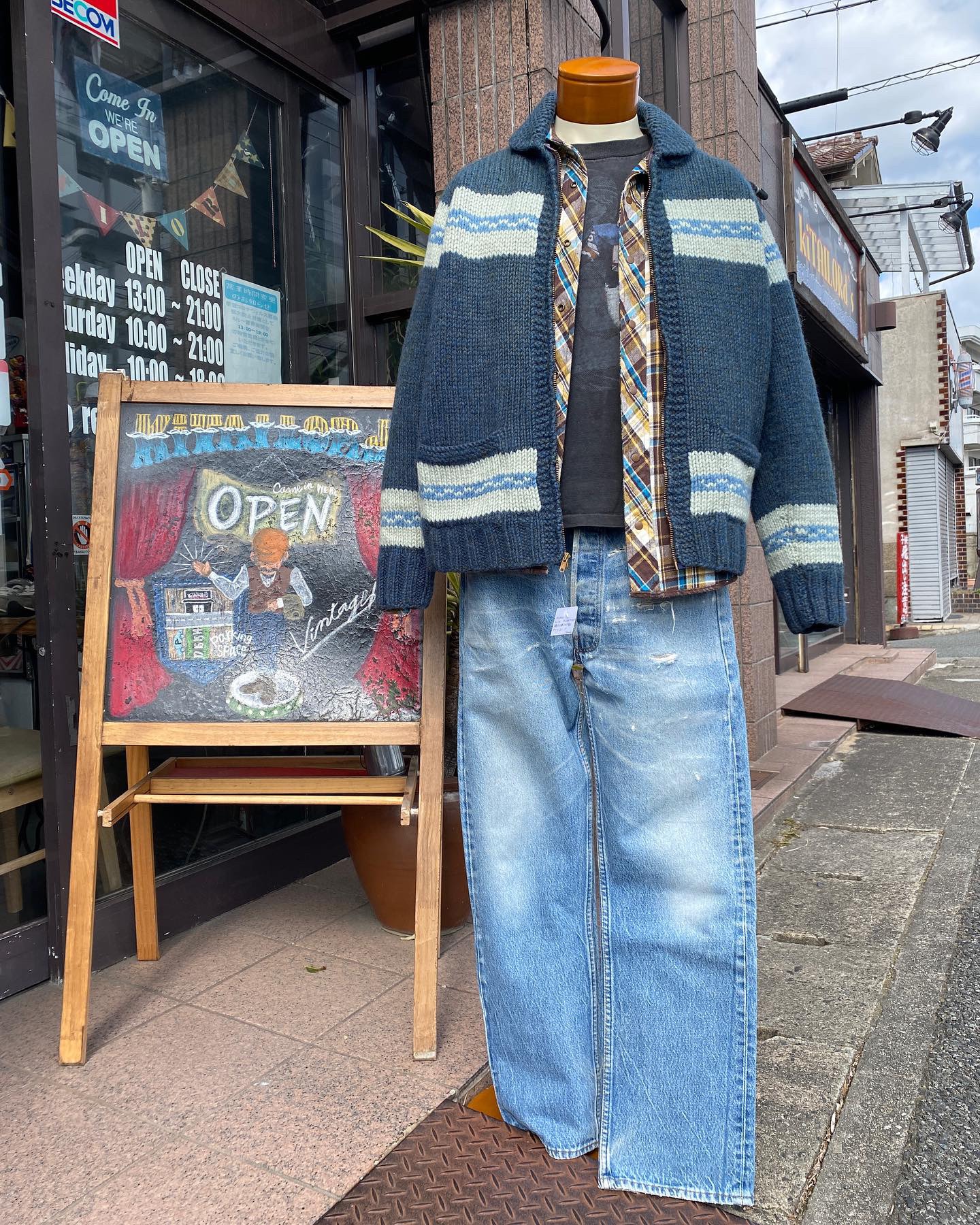 寒さが続いてることも有りここ最近またお客様の注目度も上がってるヴィンテージのカウチンセーターを羽織りに重ね着コーデ👍チェックパターンとボーダーパターンで二度おいしいフランネルのウエスタンシャツに、コットンボディが程よくフェードアウトしたNFLのTシャツ🏈ジーンズは80年代レギュラーの501を腰履きでラフに合わせて👍