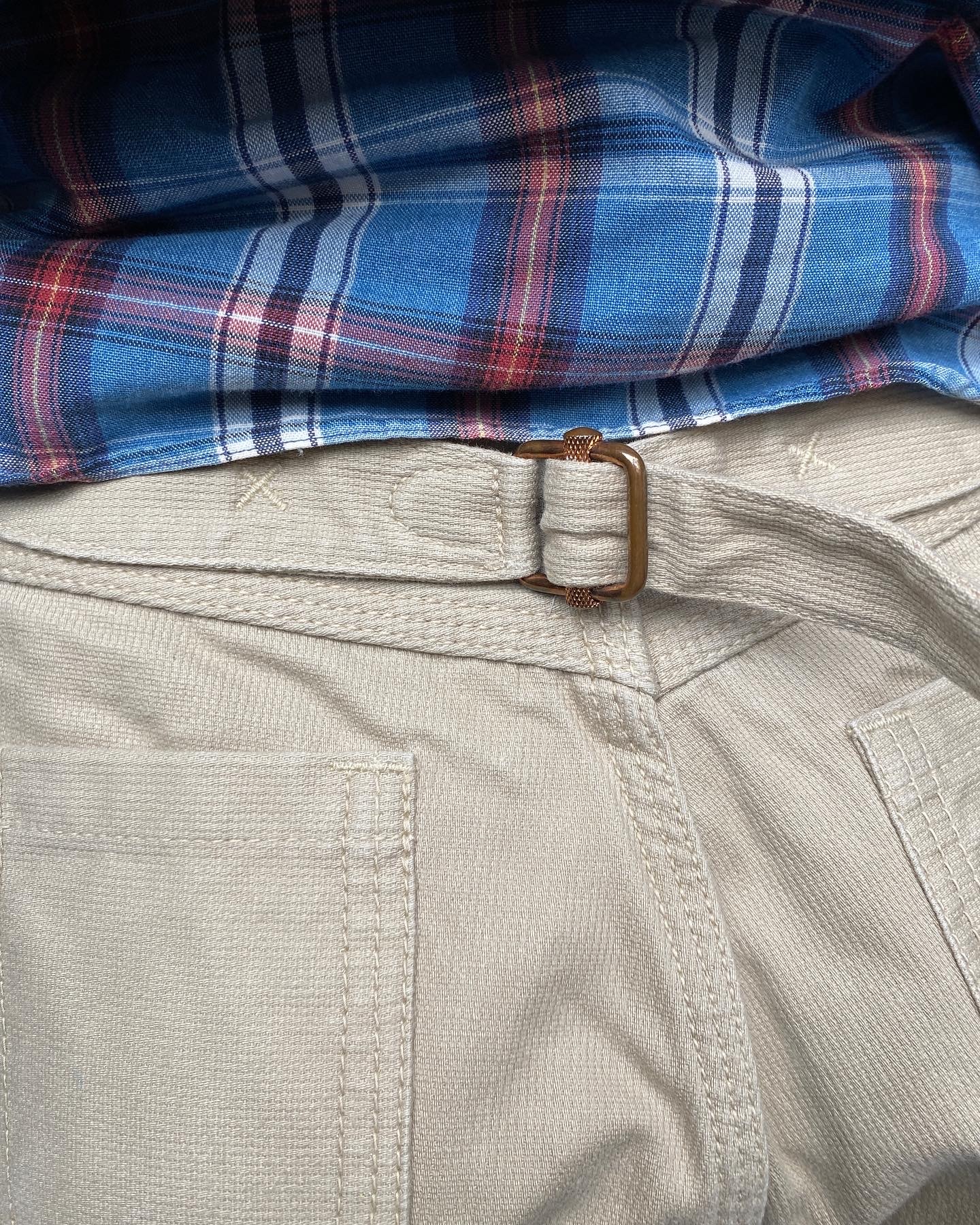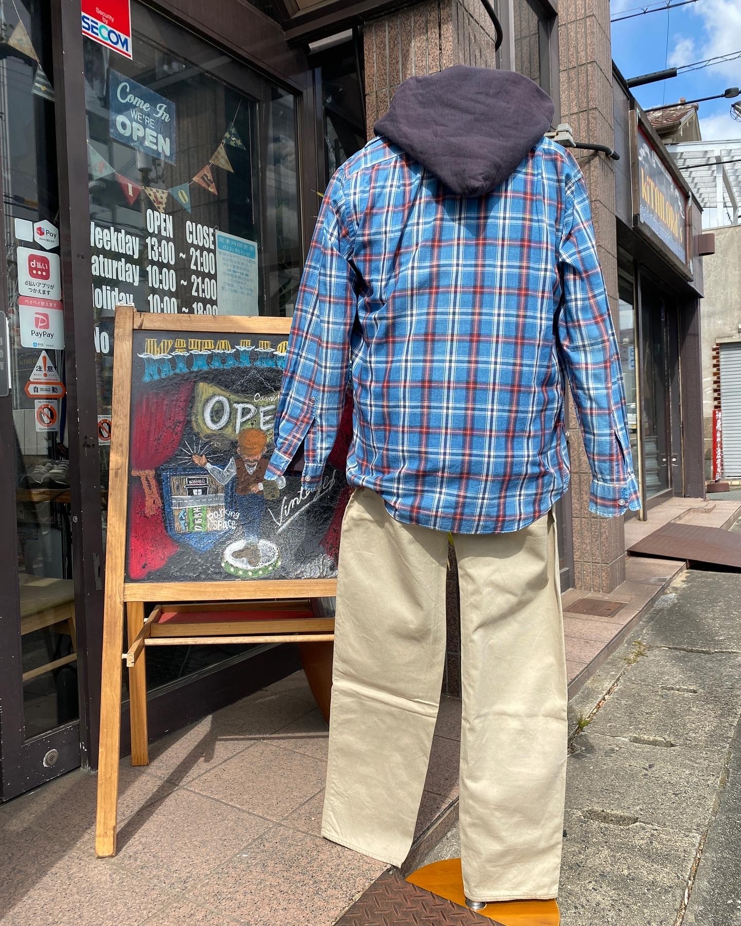 インディゴチェックのシャツを羽織りに、インナーにはフロントとバックデザインが同様な象形文字風なイラストのTシャツに、ダブルフェイスで肉厚なジップアップスウェットパーカー、シャツの羽織りだけでも今日位の気温なら👌パンツはバックルバック装備のテーパードピケパンツ…エヴィスらしいスレーキのガシャ髑髏も脱いだ時にも映える一本です👌