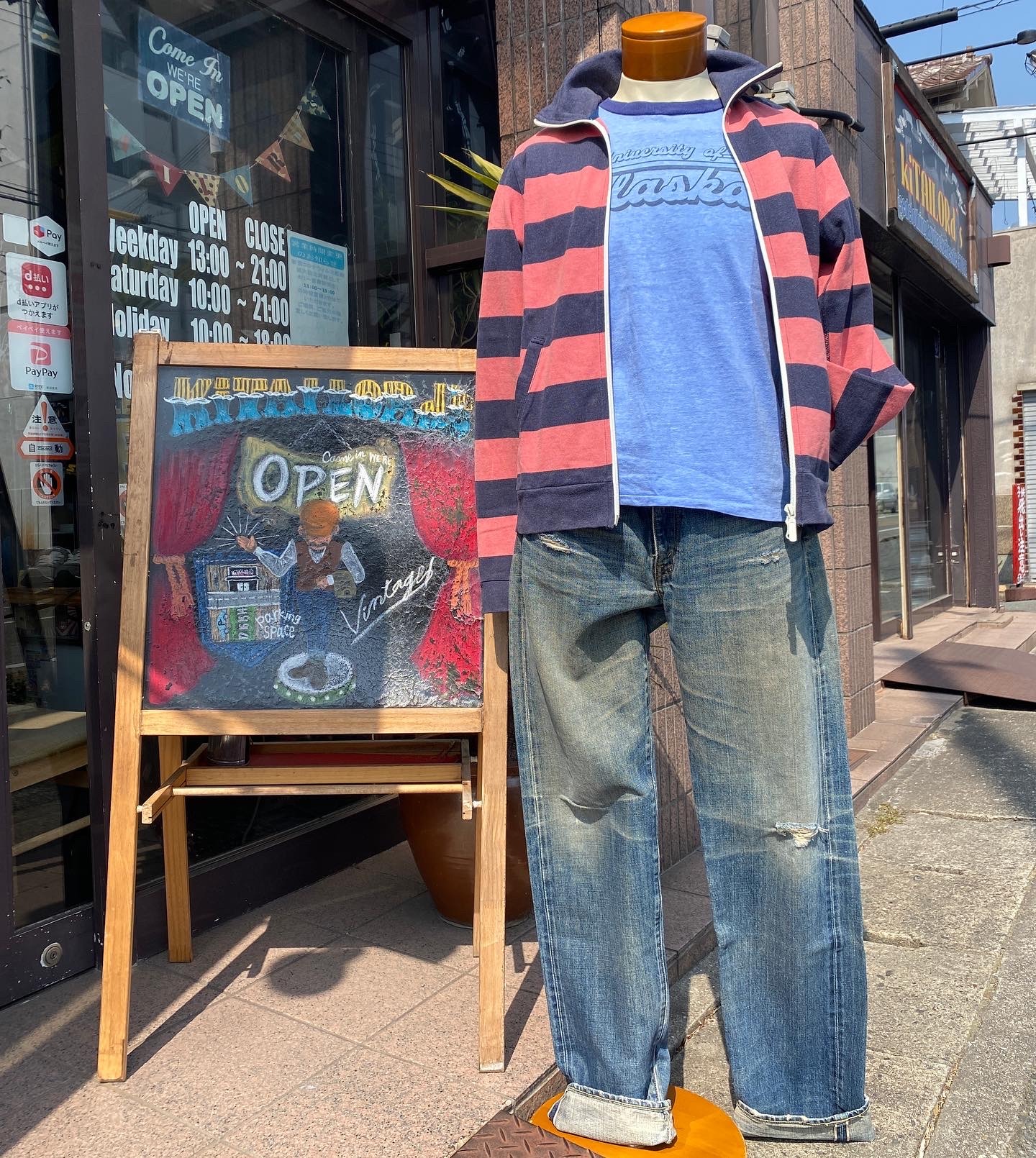 シィクボーダーのトラックジャケットは鹿の子ボディー、カラーも春色でコレからの時期に羽織りに有ると便利な一枚👌インナーは杢ブルーとネイビー2トーンのアラスカ大学のカレッジリンガーT、ジーンズはリーバイス502👖used加工と履き込みが相まってダメージ有り☝️レングス36と長めなんで背の高い方でも👌です🤠