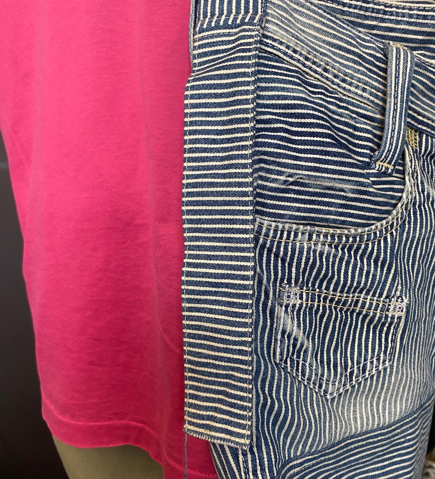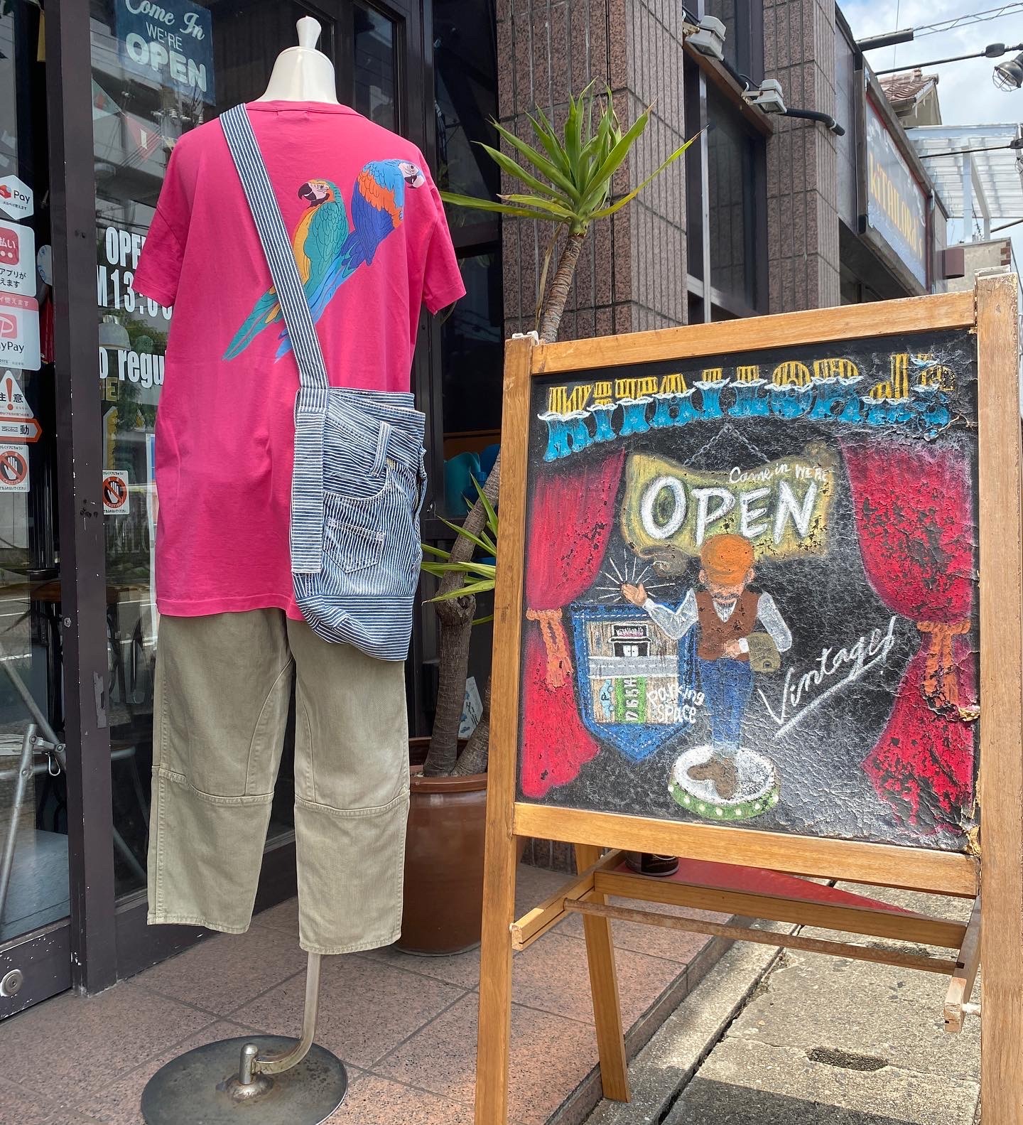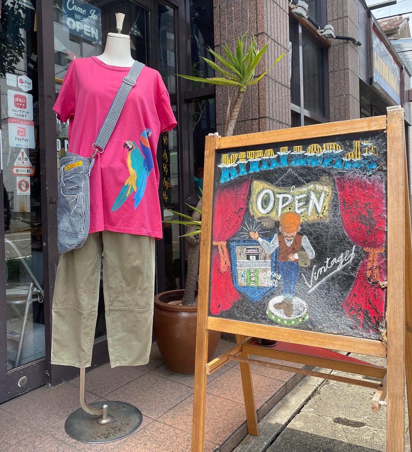 ショッキングピンクの活力溢れたボディにカラフルな色のオウム🦜がバランスよく配置されたTシャツに、所々程よくフェードアウトしたハンティングタイプのコットンパンツ、ヒッコリーパンツを解体し使用部品も全てusedパーツで、当店にて再構築したニュースペーパーバッグ🧵新旧混合の日本製アイテムでまとめ、バッグは世界に一つのオリジナル、量産商品には無い良さを是非🤠👍