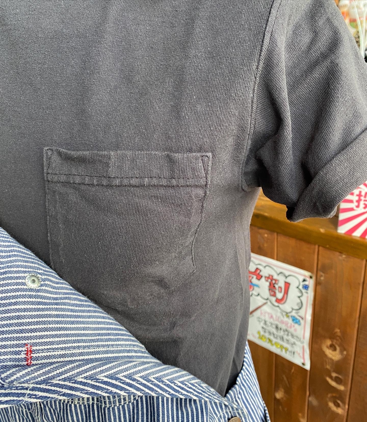 70年代、ビッグマックのヒッコリーストライプオーバーオール、普通体型ならジャスト目に着れる36インチのゴールデンサイズで、これから自分色に育て甲斐のあるグッドコンディション👌アメリカ製でヘビーウェイトのTシャツと言えば…で頭に浮かべる人も多いであろう、グッドウェア🇺🇸チャコールグレーのボディカラーのポケTは、武骨さをより引き立てるようにSサイズでタイト目に合わせて、袖もロールアップし漢くさくワークスタイルで👍