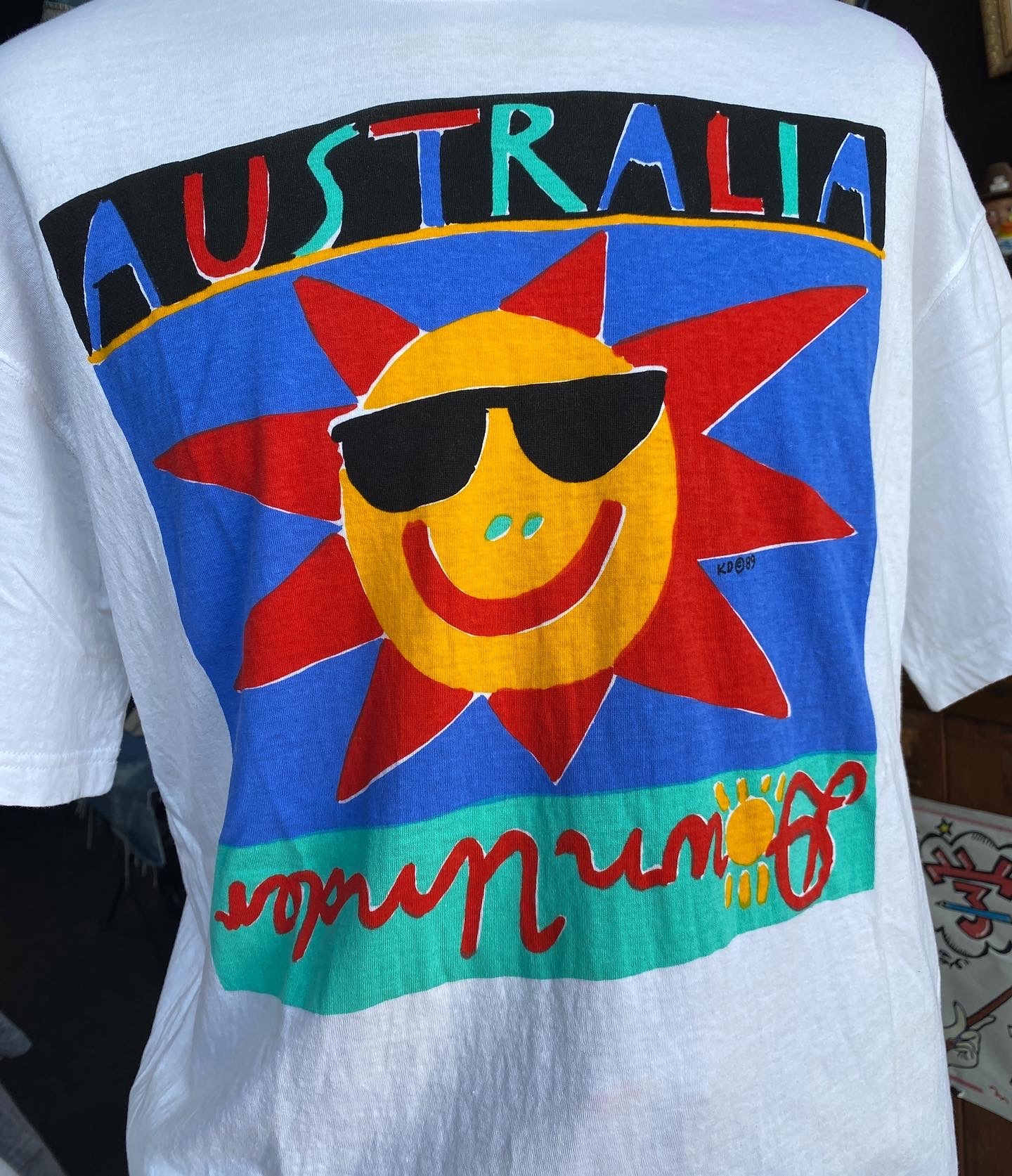 先ず一つ目は、最近の自分の推しでも有るオーストラリア製のTシャツ、薄手のコットンボディーに今日の天気のようなイカした太陽🌞プリントのカラーバランスが良いんです💮
