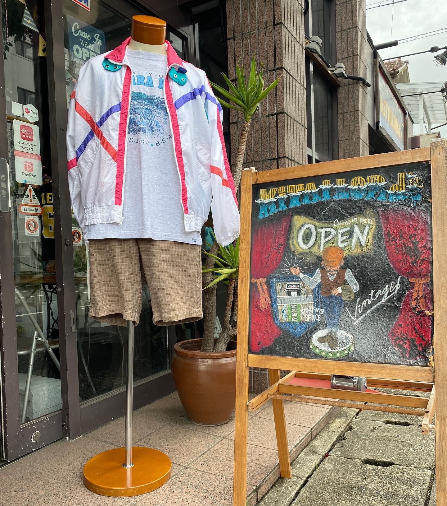 ノースフェイスのクライミングショーツにナイアガラの滝のTシャツ…壮大な滝にボディはギアスポーツのヘビーウェイトコットンにサイドスリット👌羽織りはシンプルなホワイトベースにパステルカラーのデザインが古着感を楽しませてくれるナイロンジャケット🌈少しずつ秋に向けたアイテムも追加してます🤠👍