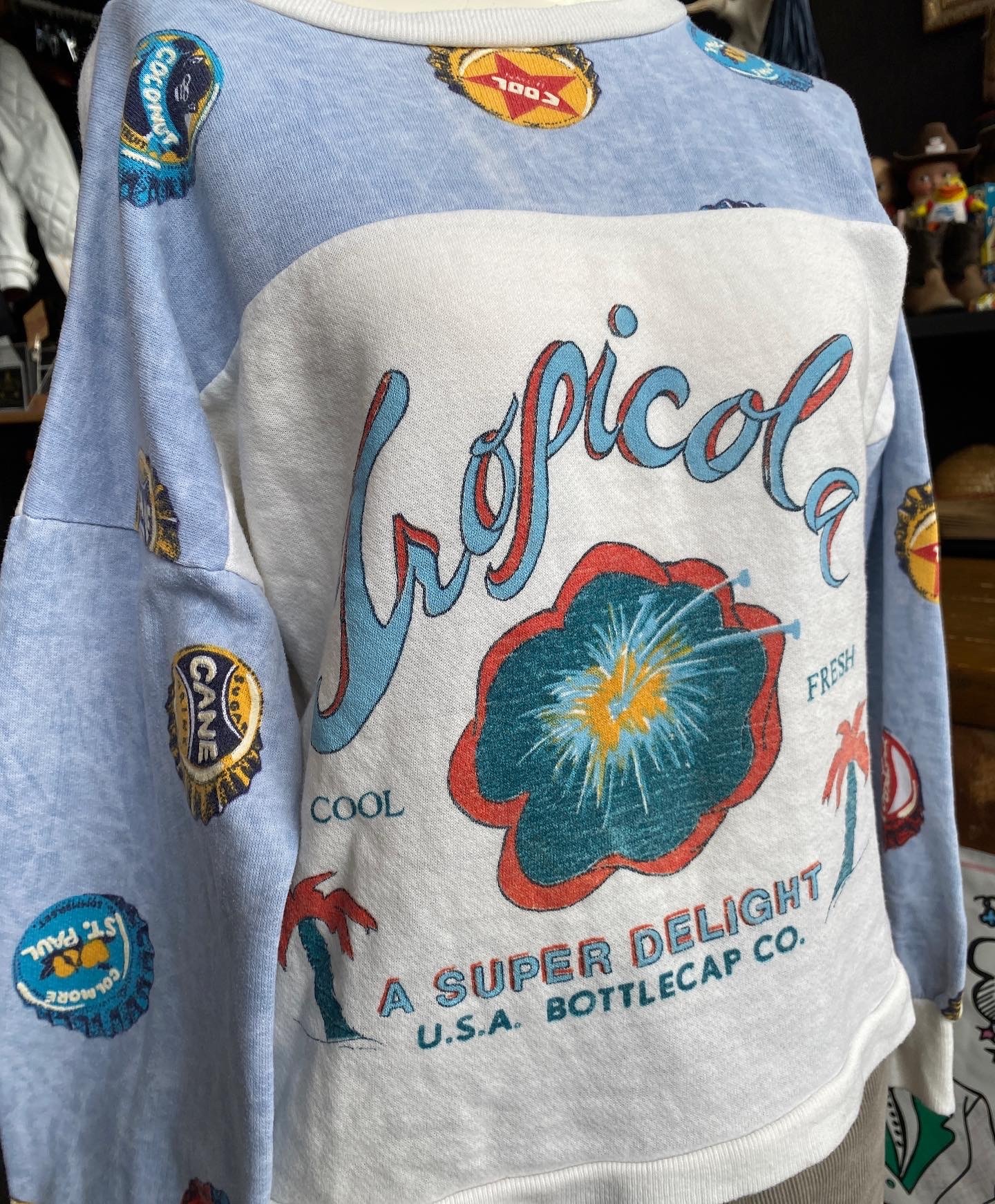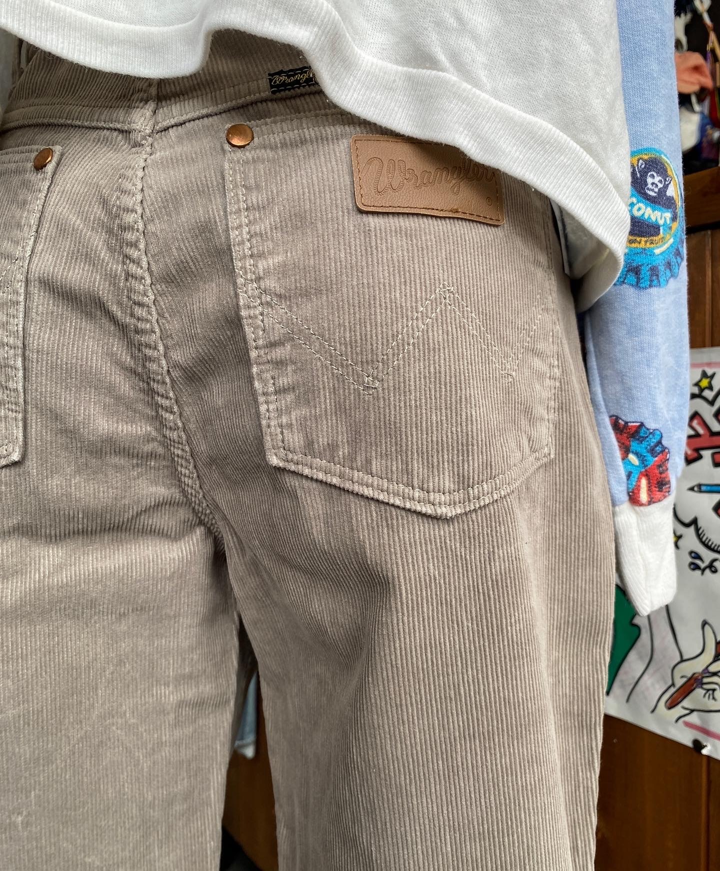 注目度も増してきたコーデュロイパンツはスッキリとしたアンクル丈のフリンジ処理のラングラー💁🏻♀️合わせたトップスは、ボトルキャップのデザインと切替パターンも珍しいショート丈のUSメイドのスウェットシャツ🏄🏻海が好きな女性にオススメです🤠