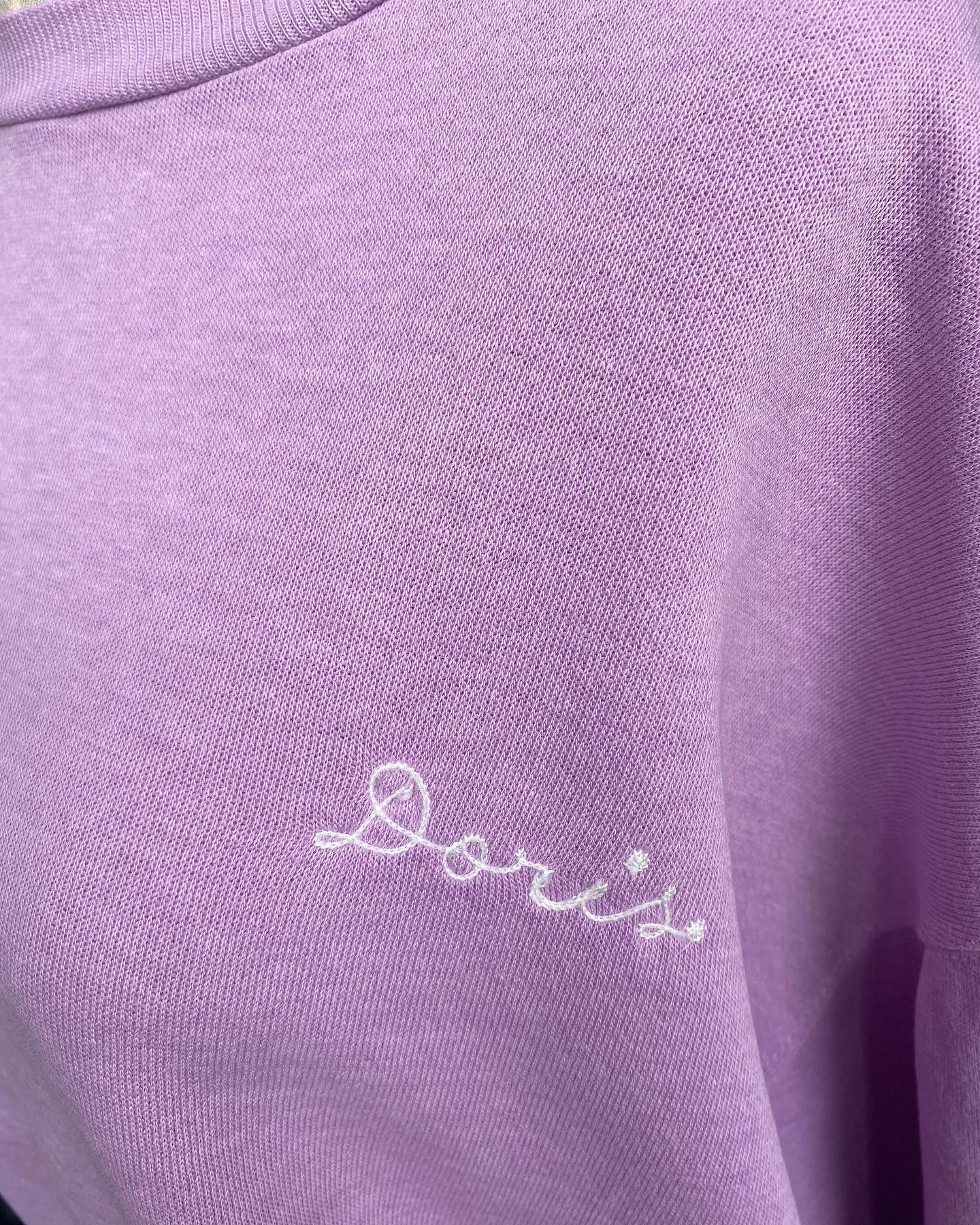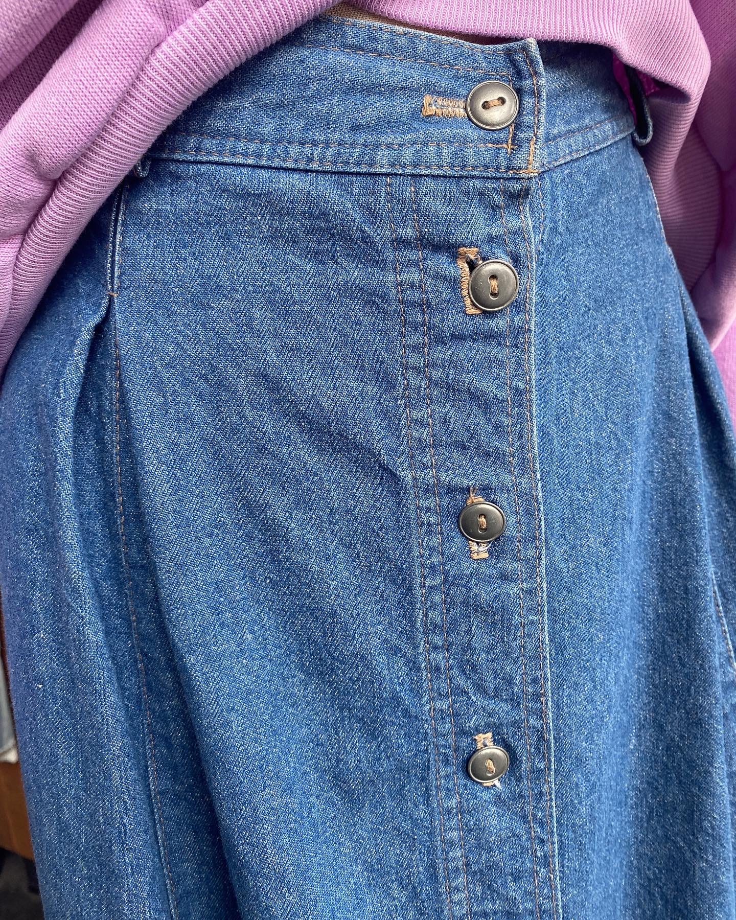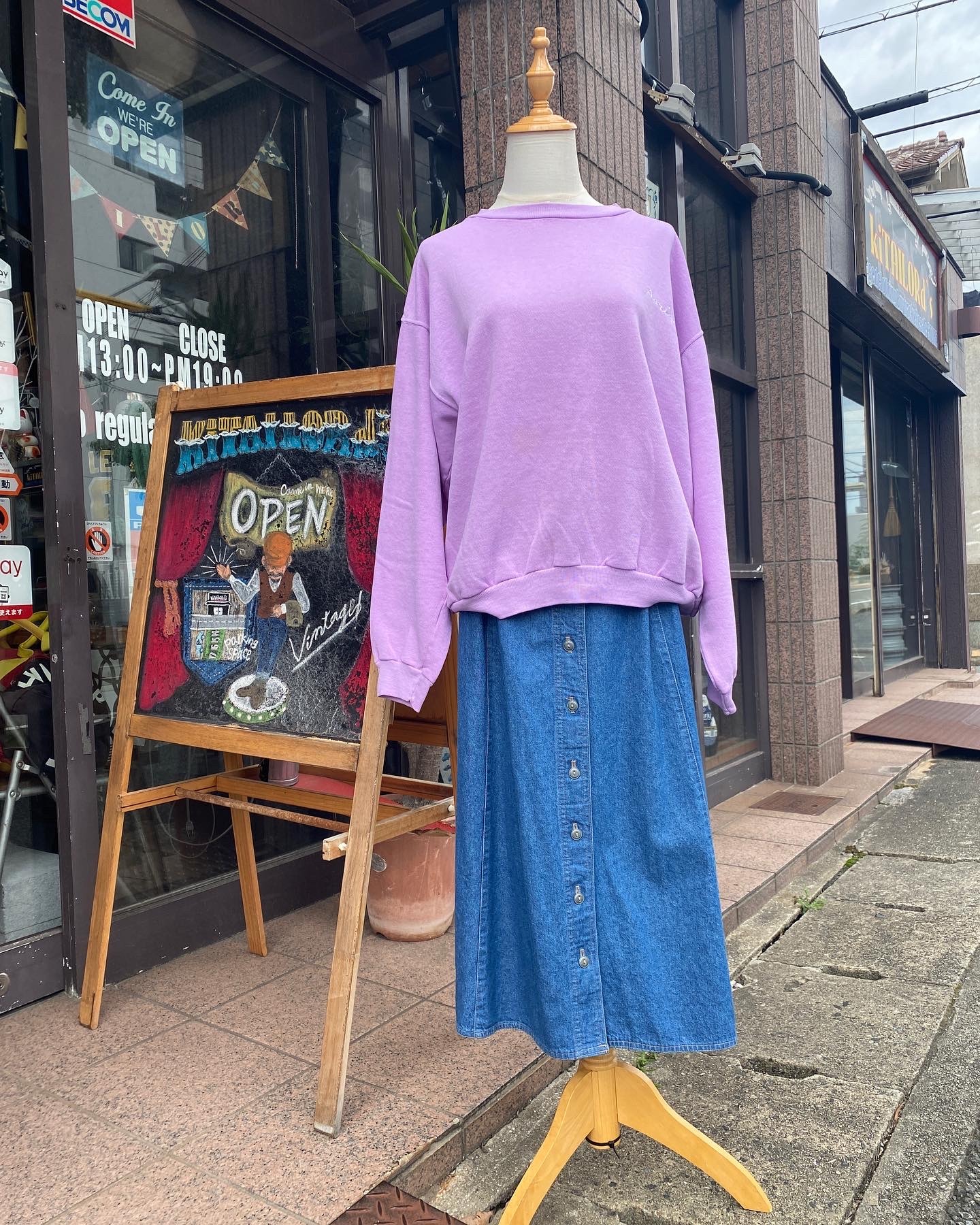 70年代後半から80年代前半の色見が独特なラベンダーのプレーンスウェットに胸にDoris.のネーム刺繍🪡🧵合わせたデニムのボタンスカートも80年代で、フロントタックにウエストベルトはバックはゴム仕様…サイズは少し大きめなんでサスペンダーで吊ってオーバーサイズで履くのも良いですよ👌