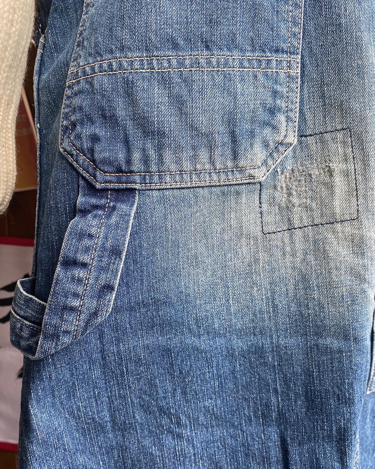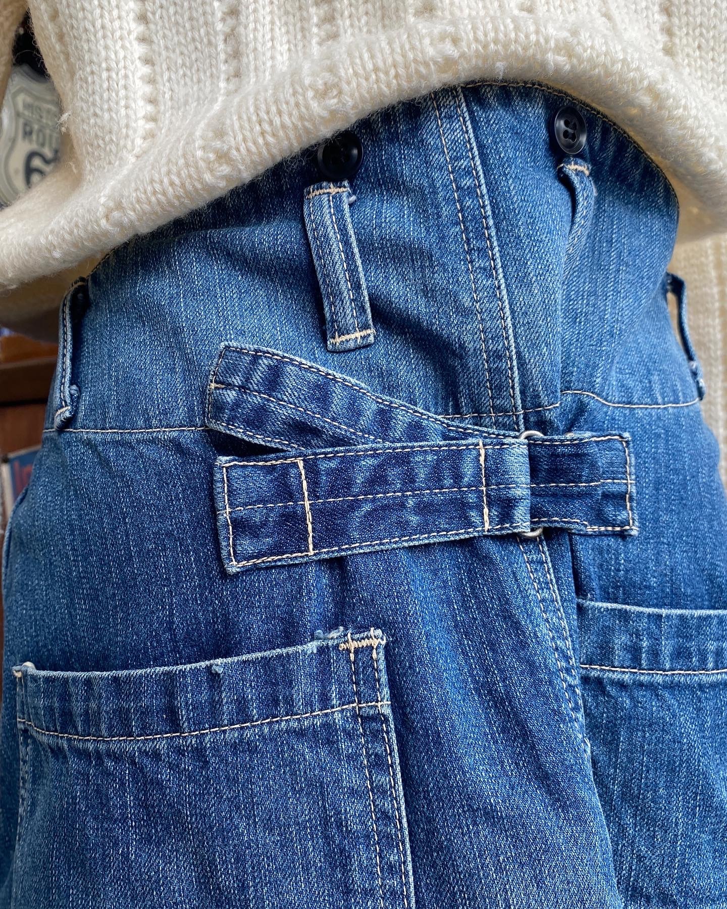 デニムの聖地、児島メイドのペインターデザインのデニムスカート、流石の一言なリペア加工にサスペンダーボタンにバックルバックと贅沢仕様👍Sサイズですが、少し大きめな感じなんで今日はバックルバックで調整して、トップスはシンプルにケーブルニットをチョイス🤠夏のシーズンはTシャツと✌️