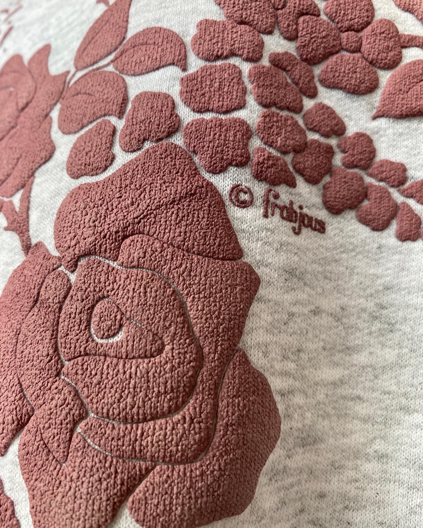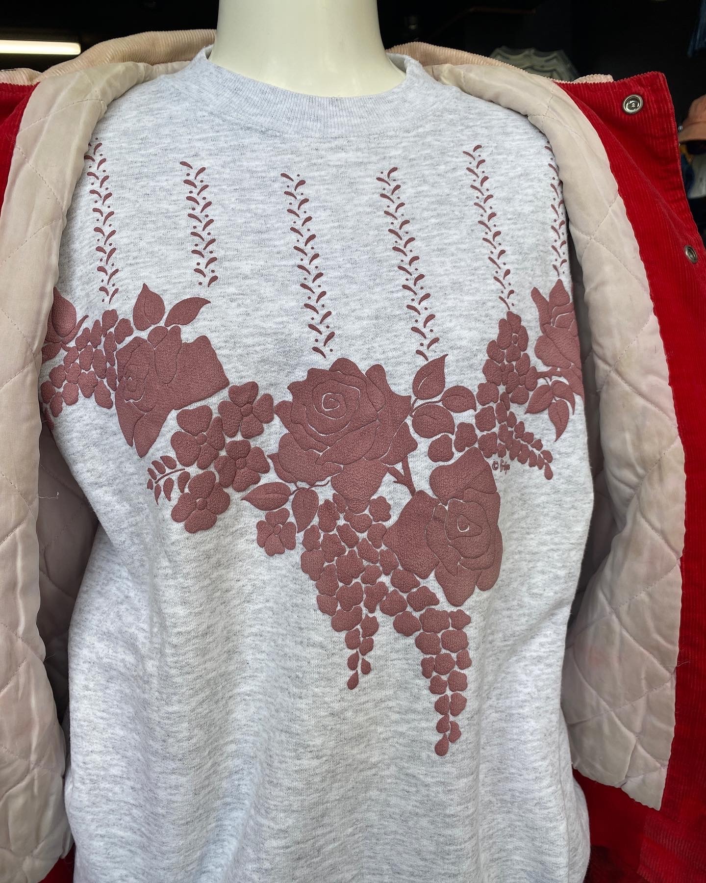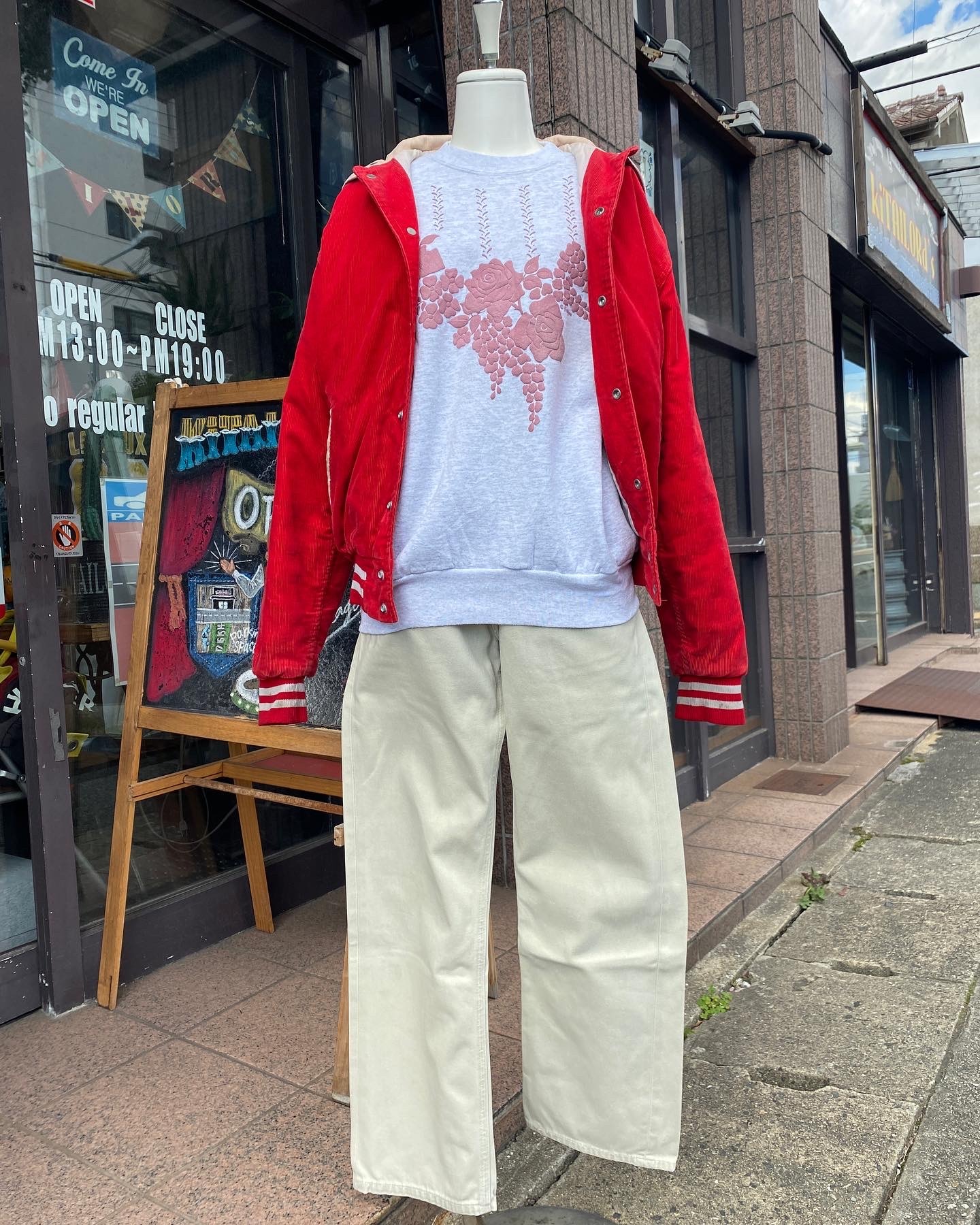 セーラータイプのシンプルなコーデュロイジャケットに、女性らしい花柄でモチモチな発泡プリントのスウェットシャツ…写真には写ってませんがフロントのみならず腕にも☝️パンツはコットンサテンのLeeウエスターナー、エドウィン企画の復刻日本製ですが、アメリカ製のスコーヴィルジッパーを使うなどポイントは押さえてます👌