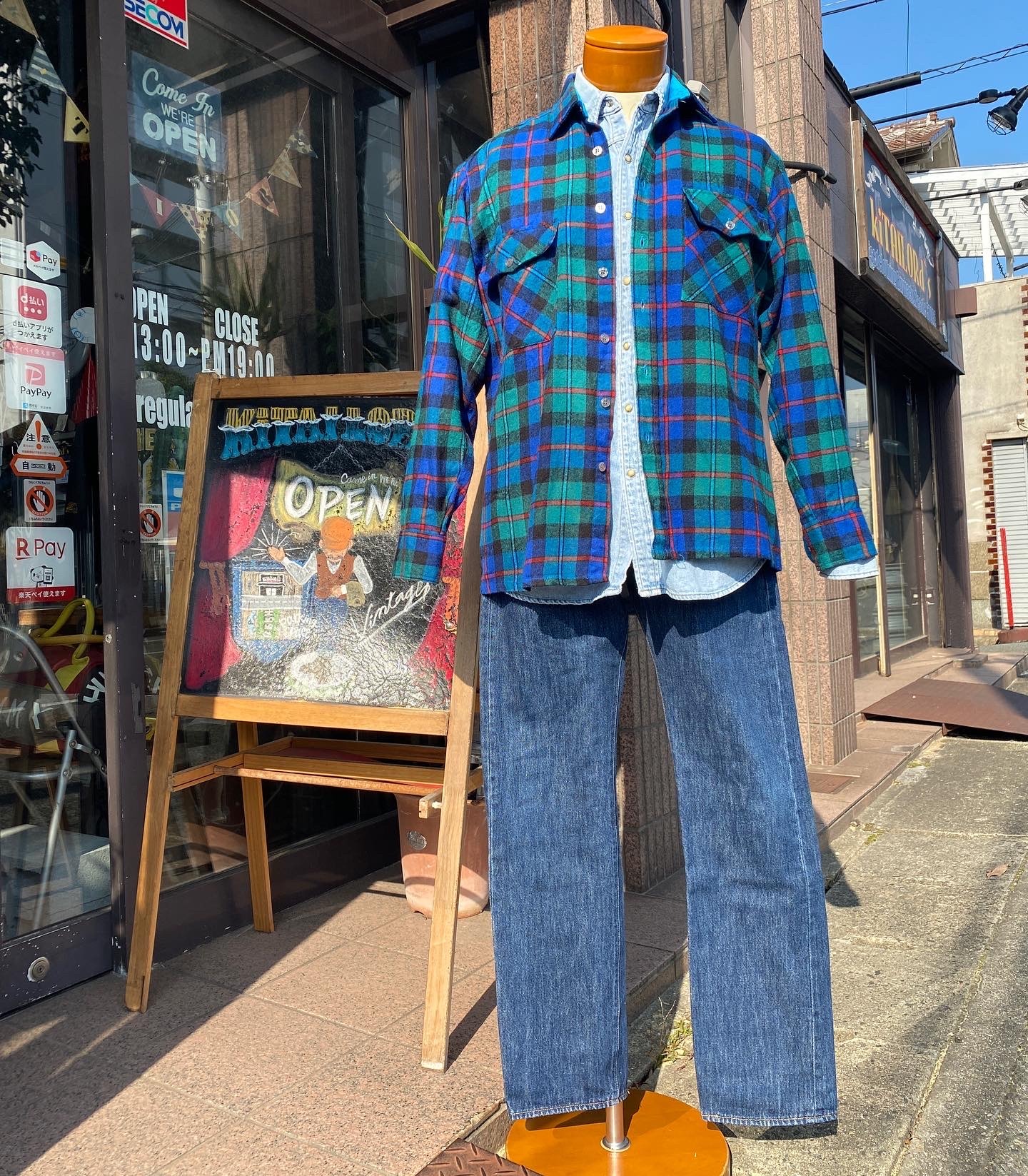 シャツonシャツにデニムonデニム👍トップスは防寒性も期待出来るアクリルシャツは、チェックパターンのボックスシルエットと、程よく着込まれエイジングしたデニムウエスタン🐎ジーンズは普段履きに気にせず使える現行のリーバイス501👖濃紺なんでガンガン履いて自分色に育てるジーンズ入門に👌因みに今日は自分もシャツonシャツにデニムonデニムです🤠