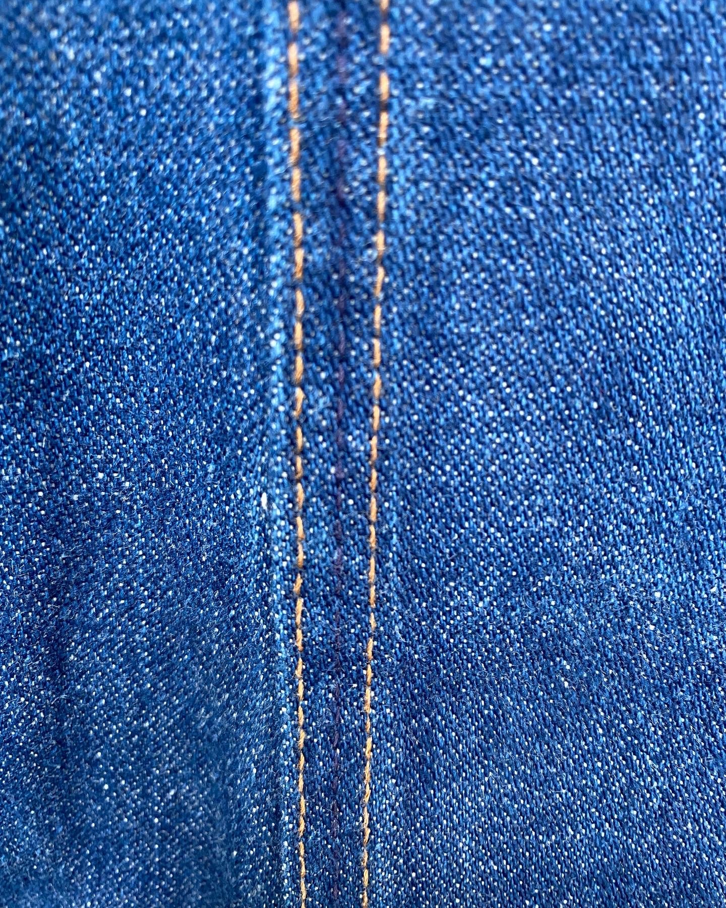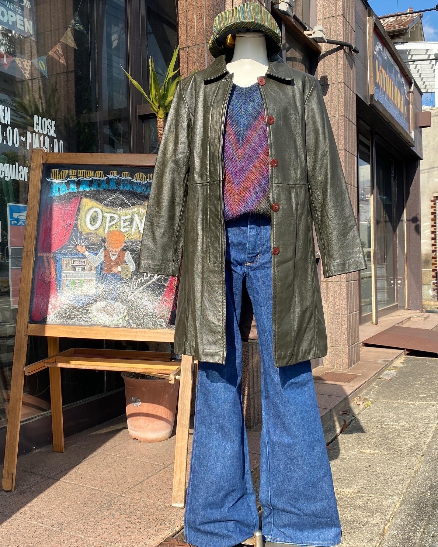 大人な女性にかっこ良く着こなして欲しい70年代ファッションをテーマに、大阪の八尾でものづくりされている宮川製帽さんのキャスケットに、深緑色の落ち着いたカラーにフライフロント仕立てに上品さを感じるレザーコート、インナーはVネックにV字にグラデーションされたモヘヤウールのハンドニット🧶ジーンズは濃紺なマーベリックのベルボトム👖アタリ(パッカリング)が楽しみなジーンズですが、あえてアタリが出難いようにアウトシームはトリプルステッチで🧵ワークパンツと区別すべくセンターステッチは紺色で分かり難く縫製していて、この時代のものづくりの奥深さも感じれる長く付き合えるグッドコンディションな一本です👖