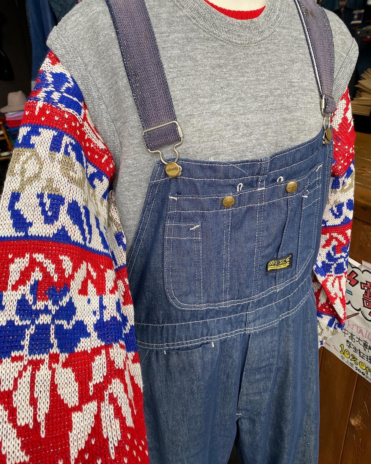 バットダイデニムの90年代タフスキン🇺🇸フェードアウトしたショルダーストラップは古着らしい雰囲気ながら、バットダイデニム特有の色落ちし難い生地は濃紺で、バックのガチャポケットも👌色合い鮮やかなニットをインナーに、重ね着でタマ数少ないスウェットプレーンベスト🇺🇸シンプルなベストを使う事で少し落ち着いた印象に…久しぶりにオーバーオールを使ったアメカジ女子で💃🏻