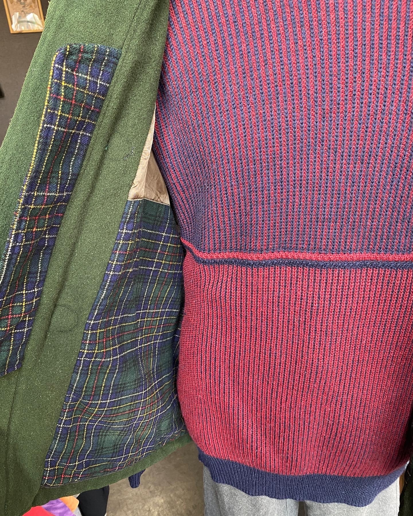 落ち着いたグリーンカラーのウールダッフルコートに上下で切り替えられたノルウェーニット、サスペンダーボタンにバックルバックでファッション性も高いデザインのスウェットパンツ、ジャケットなどと合わせて綺麗な着こなしにも使えるイタリア製のちょっと大人なアイテム…休日のおともにオススメです🤠