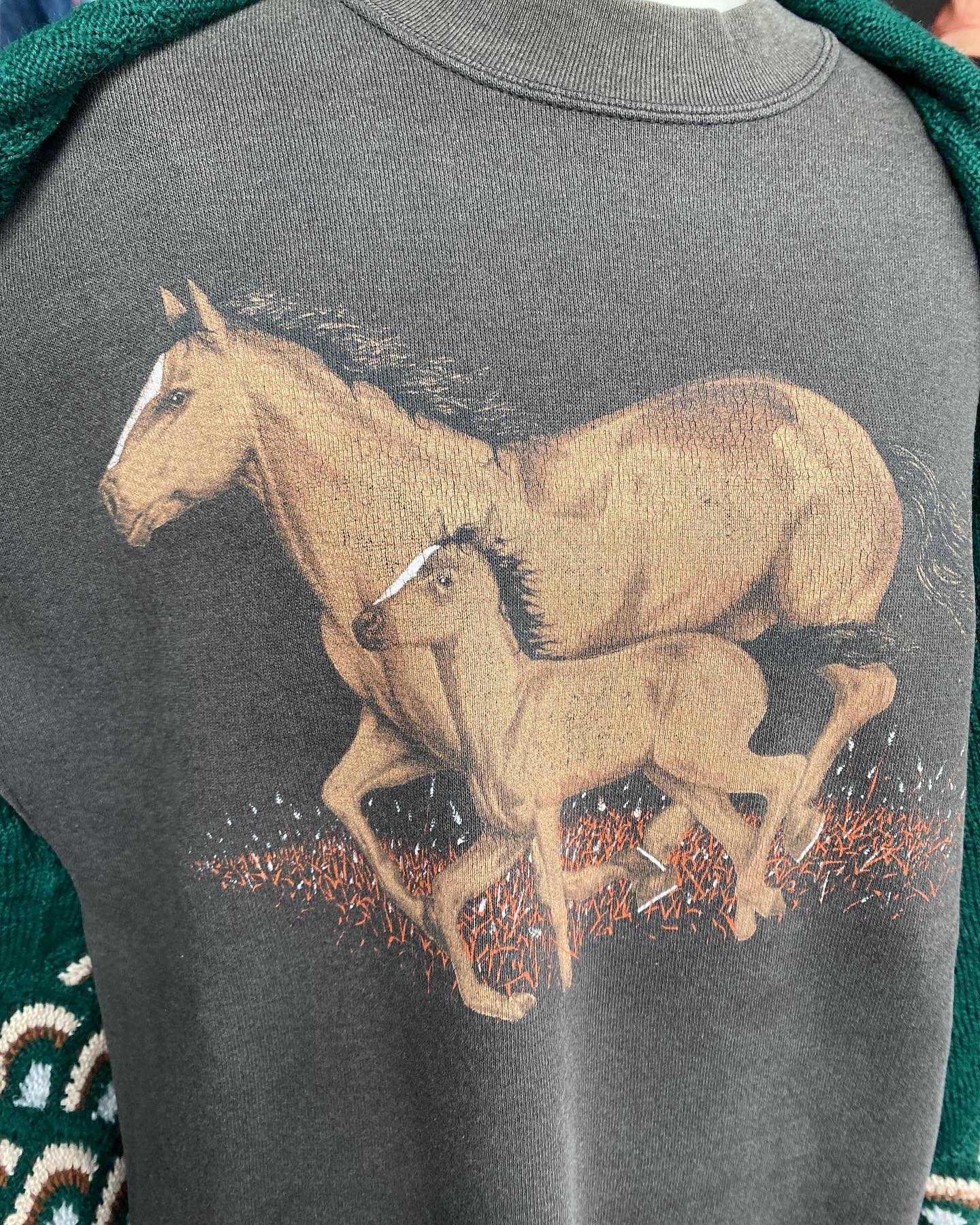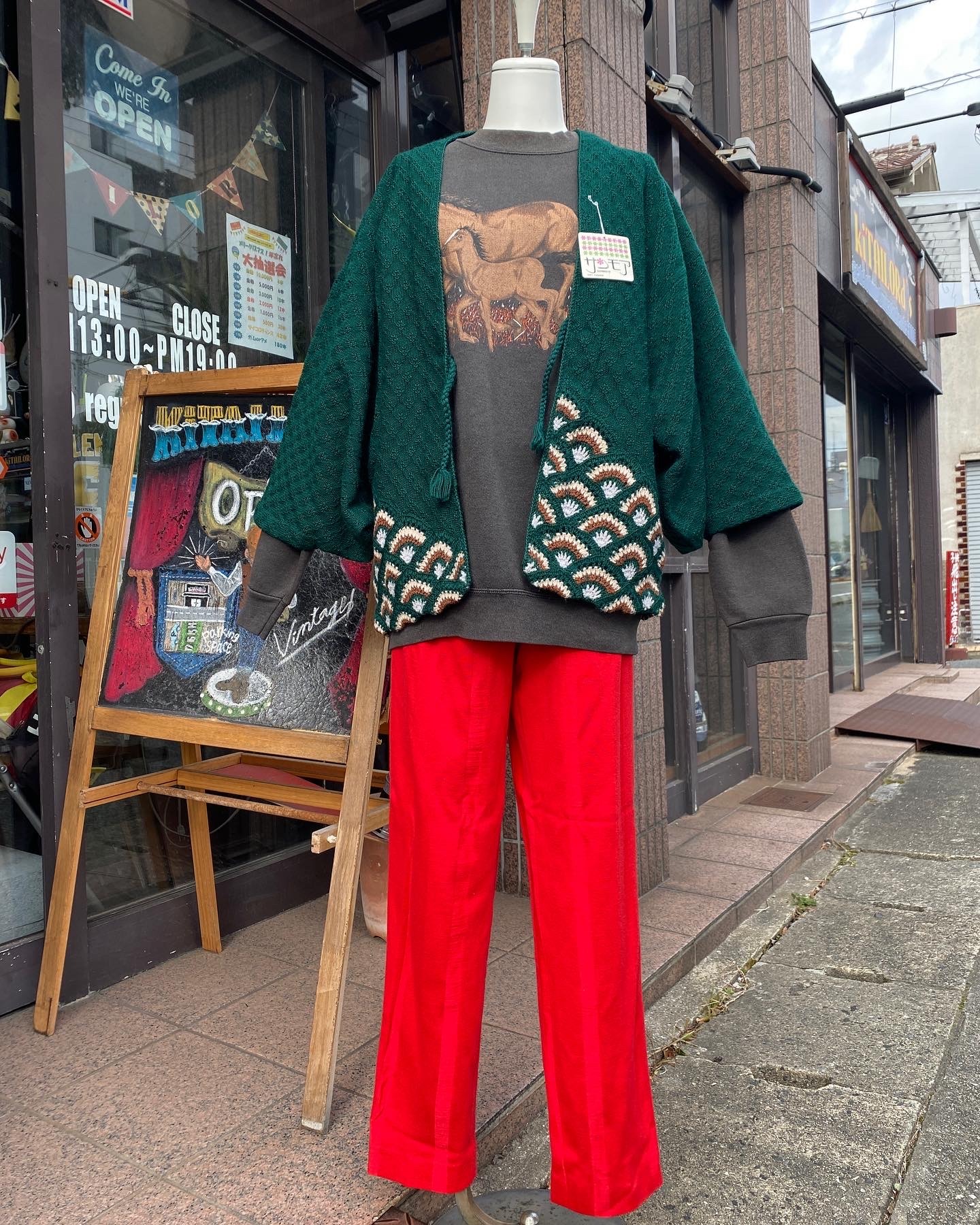 なんだかんだまたクリスマスカラーの上下になってますが、お正月に屋内でのんびりと過ごすのに適した⁈コーデ🧧着物の羽織りのようなウール素材のアイテムその名も…趣味の茶羽織、レトロな雰囲気は真の古着好きをくすぐるデザイン👌インナーにはウサギの親子が良かったんですが無かったので馬の親子🐎🐴鮮やかなレッドのアクリルウールパンツは本来はゴルフ用⛳️🏌️♀️ファションとしてもオススメですが、緩く過ごしたい休日に🤠✌️