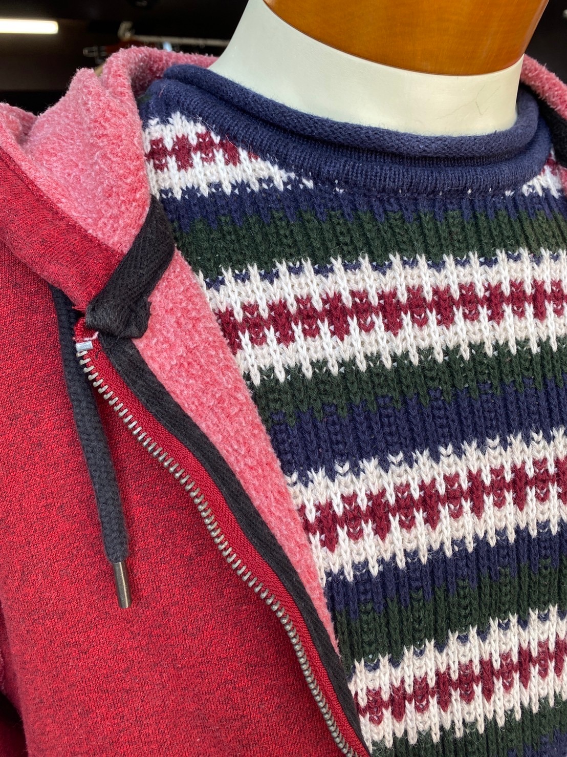 春先に使い易いフルジップのスウェットパーカーに、ラミーコットンのランダムボーダーニットはロールネックが程よく緩くこなれた感が👌パンツはチノトラウザーで裾は個人的にも好きなダブル仕上げ🤠春先に使える気取らないアメカジスタイルは、年齢関係無くオススメです👍