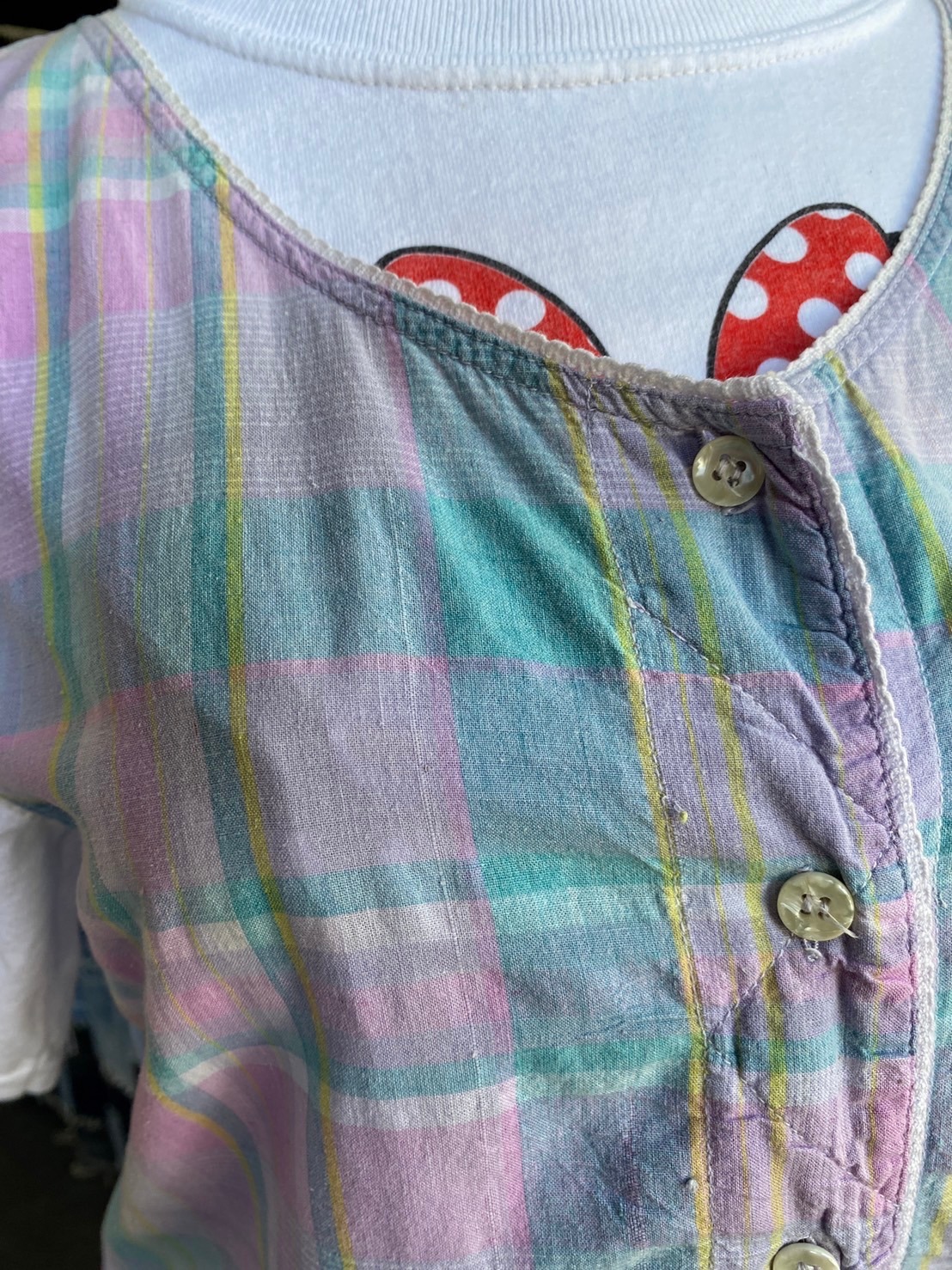 淡い色合いのマドラスチェックのノースリーブワンピースに、少し覗くドットパターンが気になる白Tシャツに、レザーバックルの上品なベルトをアクセント👍ワンピースはフロントポケットもあるので、夏本番になれば財布とスマホ位の手持ちで、夜の街に1枚でフラッとラフなお出掛けも🍻