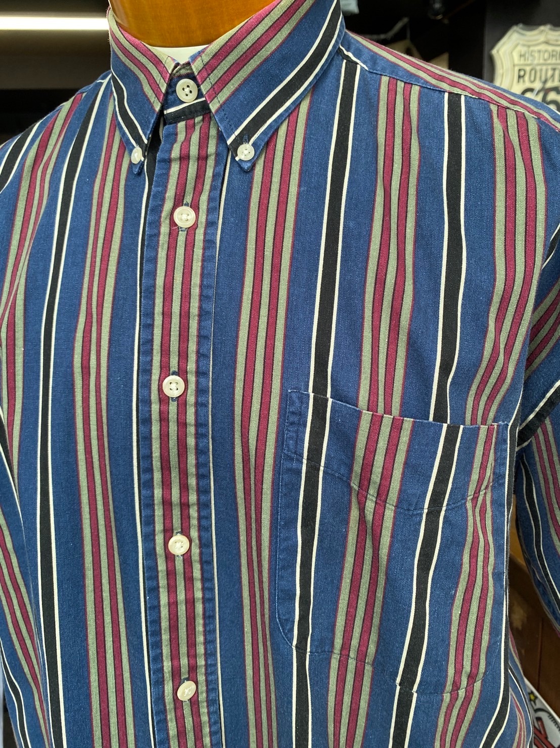 ここ2〜3日でスウェットやニットなどのネクストシーズンに向けたアイテムを手に取るお客様も増えてきたので、半袖シャツながら秋口に重ね着でも重宝する、落ち着いたカラーのランダムストライプのボタンダウンシャツに、イタリアらしいカラーでブランドロゴが刺繍されたブルージーンズ👖当時はヤンチャなイメージのジーンズでしたが、今見るとまた新鮮な違ったイメージで個人的にもオススメな90sらいしデザイン🤠シャツも90sなんで相性も良いグッドレギュラーな古着です🕺🏻