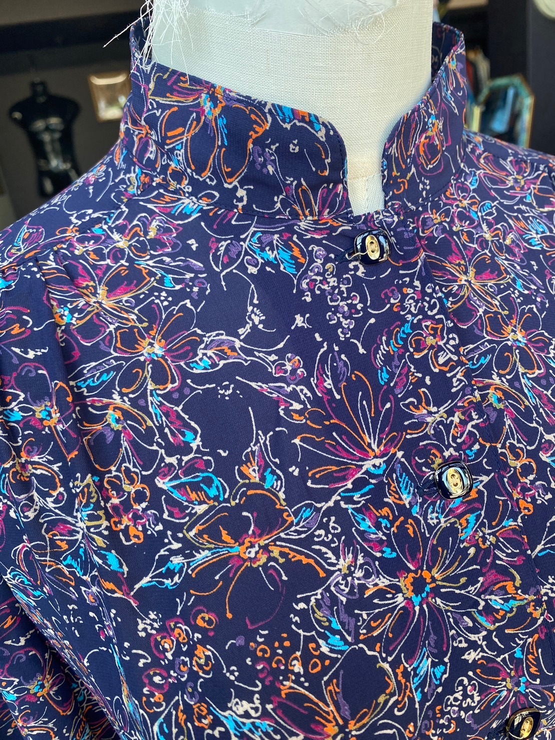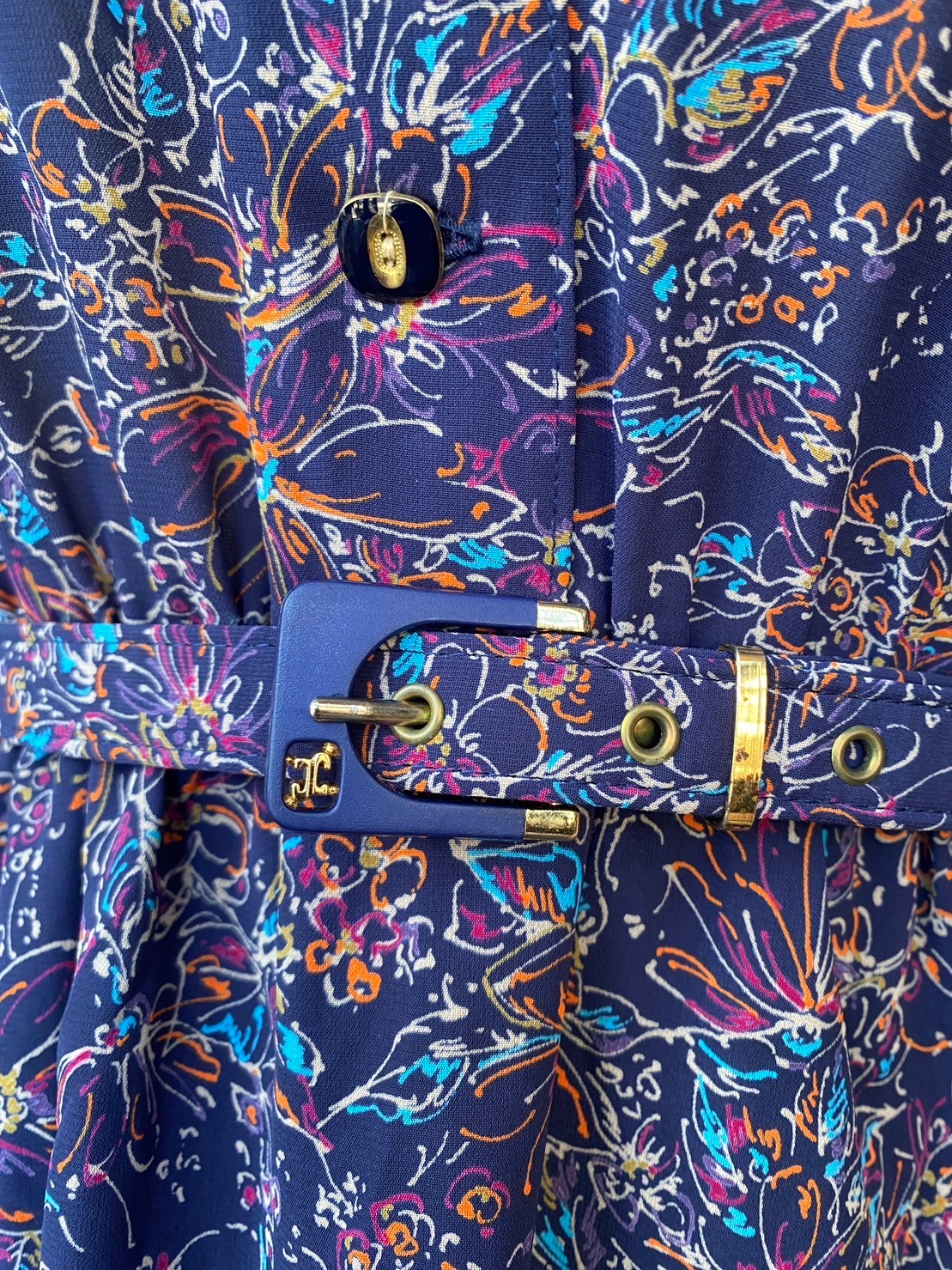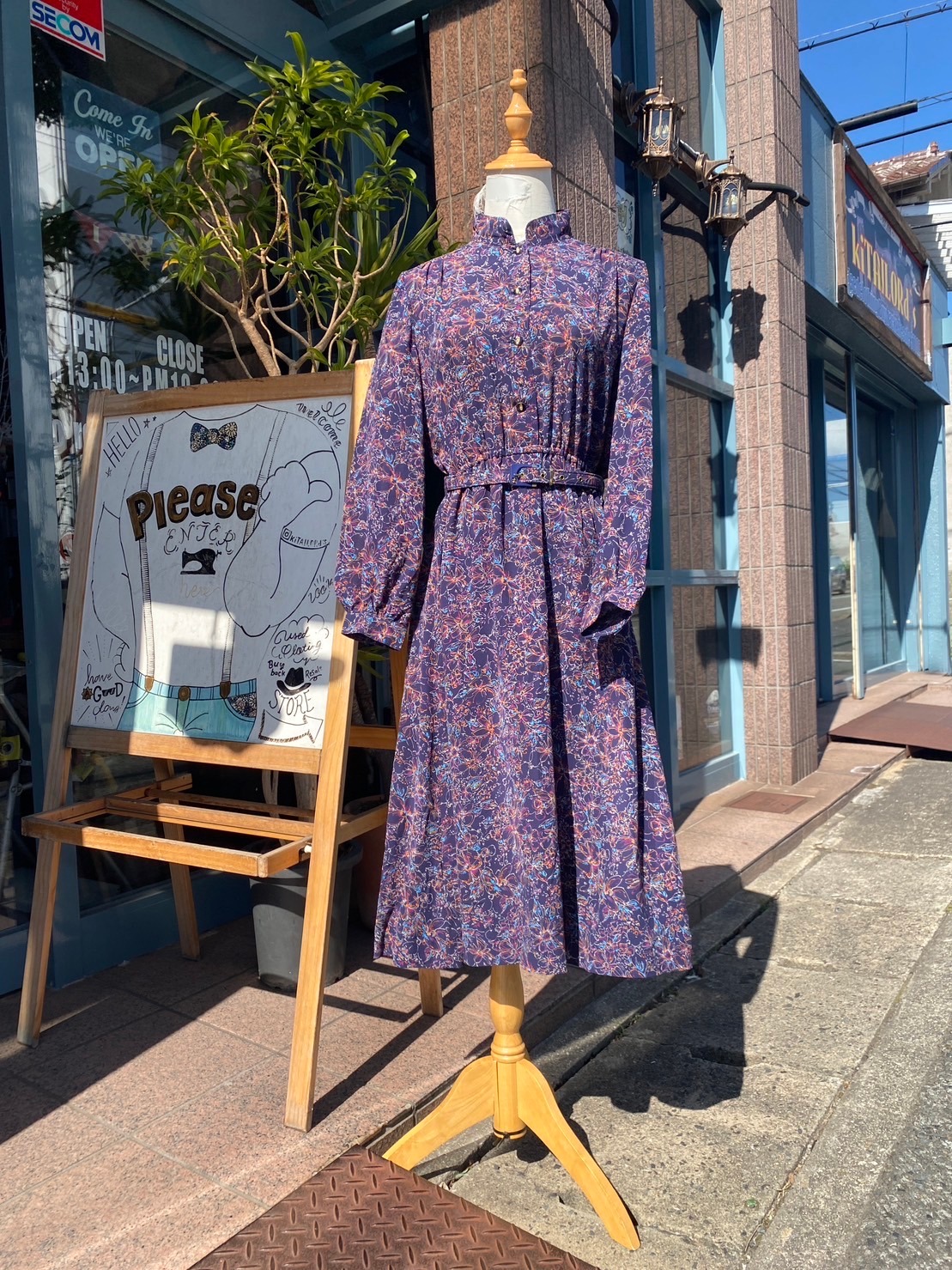 色鉛筆で描かれたような繊細なタッチの総花柄のポリエステルワンピース👗80年代頃の日本製で、シルエットはスタンドカラーに飾りボタン、ウエストラインのゴムに伸びも無く嬉しいオリジナルベルトも付属👌コンディション良好のワンピース…コーデを組むのに気分がのらない💦そんな時に1枚で様になるアイテムでは👍