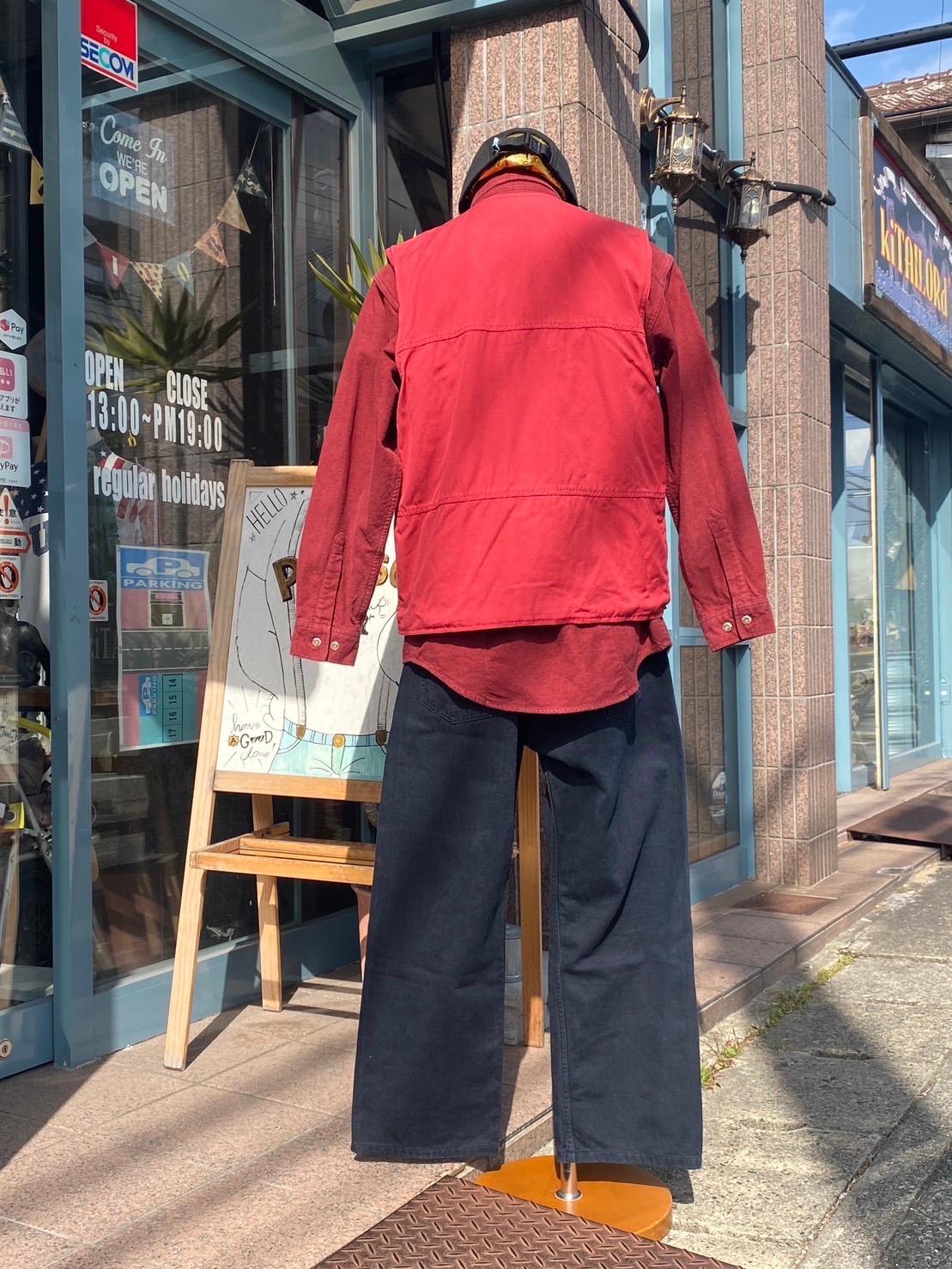 また日本撤退が決まった個人的には好きなブランド、アメリカンイーグルのハントベストにヘビーウェイトのプレーンフランネルシャツ、トップスはワインレッドとボルドーの同系色のコントラスト👌ワイドストレートのブラックデニムにジェットキャップで引き締めた印象の2トーンで春先にも重宝するスタイリングで🤠👍