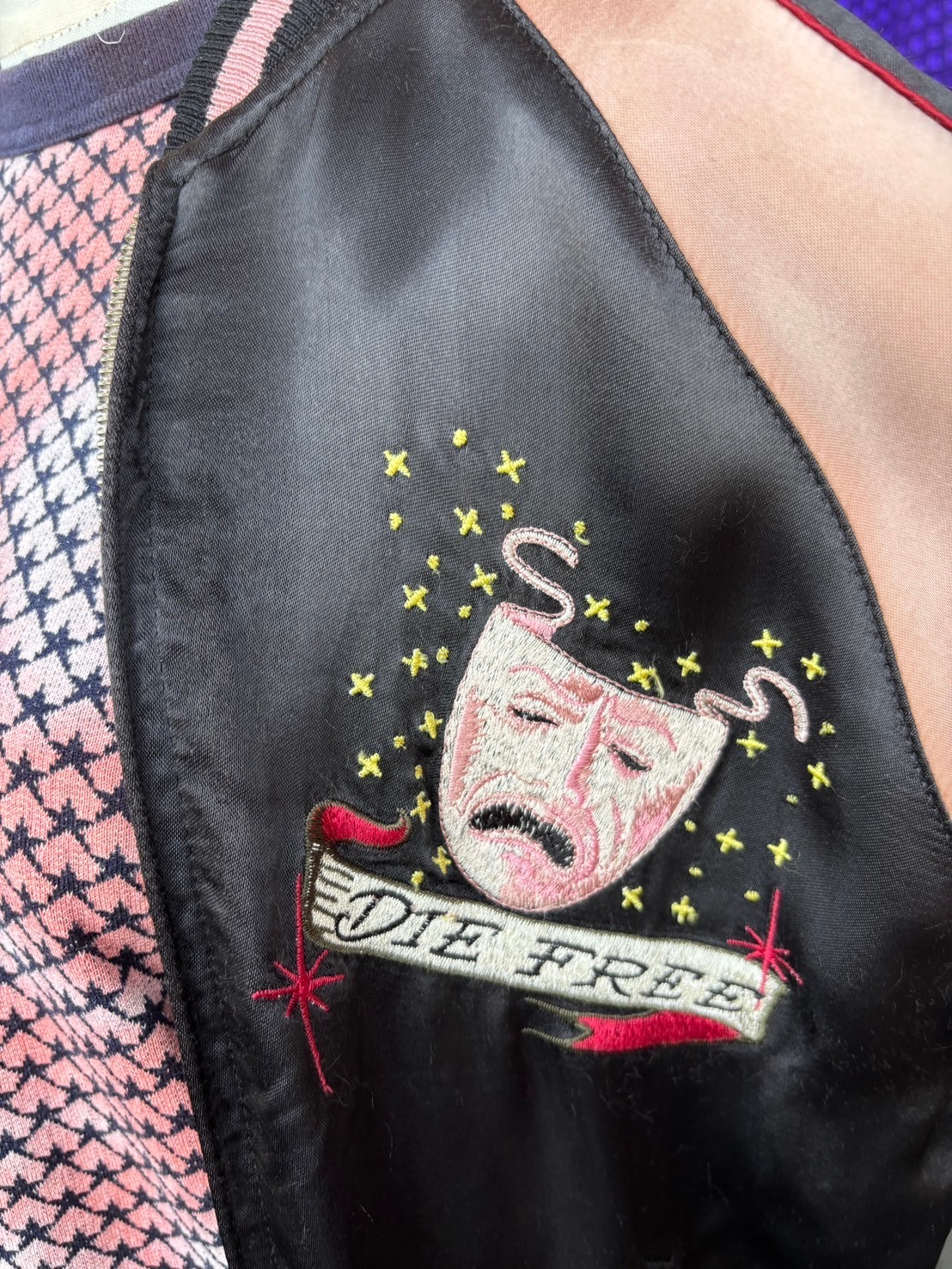 泣き笑いの表情で色々なシーンで馴染み有るトゥーフェイスと、フライングスカルにホワイトタイガーのリバーシブルデザインのレーヨンサテンスカジャン…XSサイズ🤠